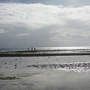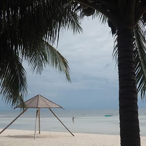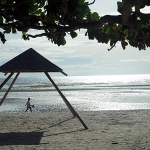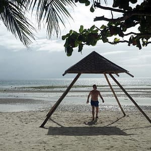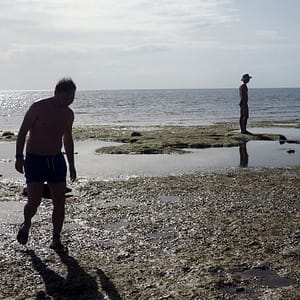 Zase je odliv, tak po piesočku precupitáme do hlbšej vodu, nájdeme si malinký bazénik – jamu v koralovej skale, narveme sa tam štyria (Rastík na deke stráži veci) a vyspevujeme už od rána – nalačno. Pláž je pekná aj počas odlivu, bielučký pudrový piesok je miestami zatopený jazierkami morskej vody, všade sú hviezdice, no paráda.