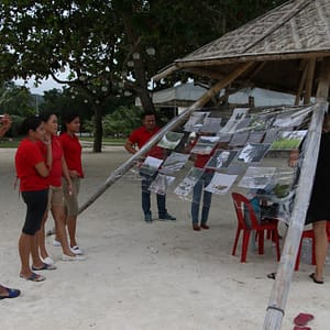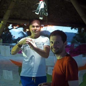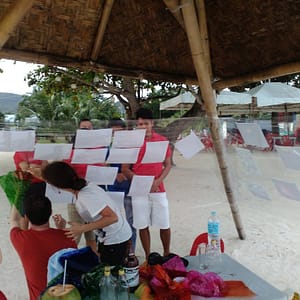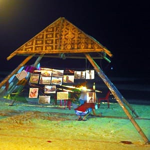 Kurátorsky, s pohárom vínka zahajujem vernisáž a potom sa presúvame k stolu pred výstavu, lebo pod strieškou je dosť teplo. Ako je pyramída zaigelitovaná, nefúka tam príjemný vetrík. Večeru si necháme naservírovať na pláži, keď vypijeme vínko príde na rad červený koník. Všetci sú radi z prvej filipínskej výstavy a svorne dúfame, že to do rána nezoberie tajfún.