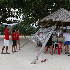 Na miestnom trhu obzeráme malé lietajúce ryby a iné úlovky – je toho dosť málo. V jedálenských stánkoch skúšame jedlo z rôznych hrncov. Roman objedná dokonca aj pizzu. Neleniaca kuchárka nám skočí do pomerne ďalekého obchodu aj po litrového červeného koňa. A to dokonca dvakrát. A prihodí si len 20 centov.