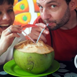 Skúšame ešte neuspokojivú kávu a lokálne pečivko a po poslednom plážovaní pred výpekom ideme na obed CocoLoco. Objednáme si kokosový i hovädzí burger, ku ktorému podávajú banánový kečup. Máme aj mangovo banánovú palacinku a vodného byvola v lahodnej kokosovej omáčke. Skúsime aj ich signatúrny drink – Coco Loco, kde je v kokose kopec rumu. Chutí to lahodne, jeden zdieľame piati a celkom to zapisuje. Máme aj prvú skutočne dobrú kávu, ktorú nám servírujú v dvoch frenchpressoch.