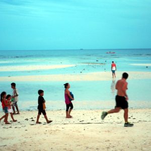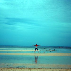 Zase je odliv, tak po piesočku precupitáme do hlbšej vodu, nájdeme si malinký bazénik – jamu v koralovej skale, narveme sa tam štyria (Rastík na deke stráži veci) a vyspevujeme už od rána – nalačno. Pláž je pekná aj počas odlivu, bielučký pudrový piesok je miestami zatopený jazierkami morskej vody, všade sú hviezdice, no paráda.