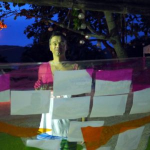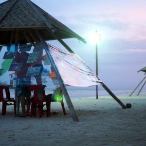 Výstavu síce tajfún nezobral, no už sa pri rannom fotení okolo motá upratovač a chce to dať dole. Ukecáme ho, nech to tam ešte nechá, no po raňajkách v Coco Loco už chýba lampáš a keď odchádzame na autobus strhne sa boj o metre štvorcové fólie do domácnosti. Aj taký býva osud aplikovaného umenia.