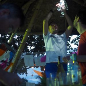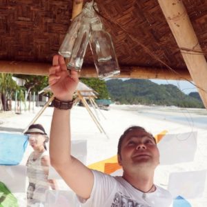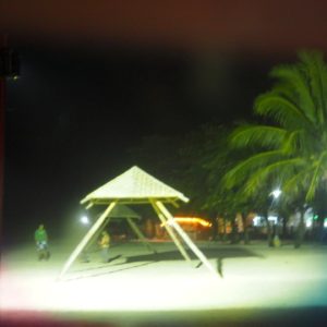 Kurátorsky, s pohárom vínka zahajujem vernisáž a potom sa presúvame k stolu pred výstavu, lebo pod strieškou je dosť teplo. Ako je pyramída zaigelitovaná, nefúka tam príjemný vetrík. Večeru si necháme naservírovať na pláži, keď vypijeme vínko príde na rad červený koník. Všetci sú radi z prvej filipínskej výstavy a svorne dúfame, že to do rána nezoberie tajfún.