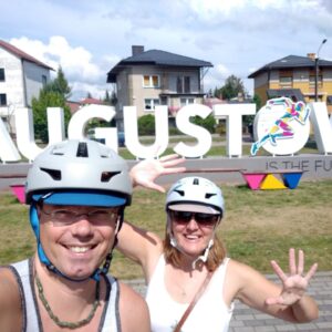 Keď konečne G prestane po niekoľkých dňoch nevysvetliteľne kýchať, vyrážame piatok 26.07. niečo po 17 hodine cez Poľsko smer Baltik. Po krátkej noci na diaľničnom parkovisku niekde pred Varšavou sme pred obedom 27.07. v Augustówe. Na bajkoch ideme krátky 6 km okruh od jazera s pontónmi do mesta. Podľa TA vyberáme 3 možnosti na obed, nakoniec volíme Fisza na brehu spojovacieho kanála. Tatarák je božský a aj parádne nastajlovaný. Rybia polievka a girice nesklamú. V ošítke s chlebom nám v ustricovej lastúre donesú maslo. Interiérový dizajn a lokalita sú top. S dvoma pivkami platíme kartou 114 zl. Pred krátkym spánkom sa ešte vykúpeme v nie moc teplej vode jazera.