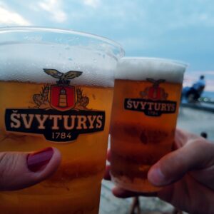 V supermarkete Rimi v Klaipéde vraciame 2 roky staré plechovky. Tu sa nám prihovára nezrozumiteľne jeden homie, ale šok máme až na pokladni pri zistení, že alkohol sa predáva len do 20 hodiny (prepásli sme to len o 27 minút). Trajekt na Kuršskú Kosu (12,30E za auto a 2 osoby) stíhame pred západom. Na známu pláž v Juodkranté dorazíme s poslednými lúčmi slnka (vstup do NP 20E na auto). V bare na dune hrá príjemná lounge hudba, popíjame prvé pivo Švyturys (4E za plastový pohár), rozjímame nad nekonečnostou Baltického obzoru a belobou pláže. Prekvapivo vôbec nie je zima, na páperky to nevyzerá. Na parkovisku sú 3 kemperi. Toalety sú vynovené a otvorené celodenne.