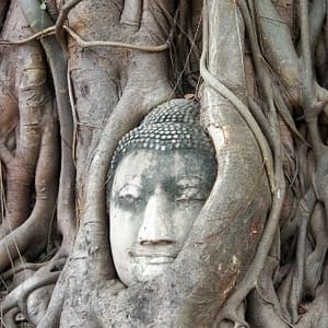 Keď sme tu boli posledne asi sme iba jazdili naokolo, teraz platíme po 50B za vstup do chrámu, majú aj 220B pass na 6 chrámov, to ale v tomto teple asi nedáme. Chrám je pekný, je tam Budhova hlava vrastená do koreňov ako najväčší trhák. Ideme ďalej schladiť sa ľadovou kávou a vymyslieť plán cesty.