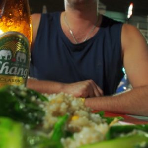 Riadne zbití sme sa po návrate na ostrov zastavili v 7eleven, že si dáme pivo k arašidom na ruinách oproti. Vrátili sme bajky a po sprche išli rovno na masáž, kde som si aj trochu pochrapkal. Večerali sme na rohu, tam kde včera. Pivo Leopard nemali, tak nás poslali si ho kúpiť. Zase výborna pražená ryža bez mäsa a keďže nemali dary mora, tak fajné nudle s kuraťom.