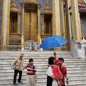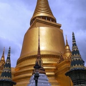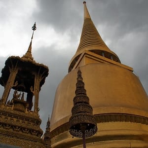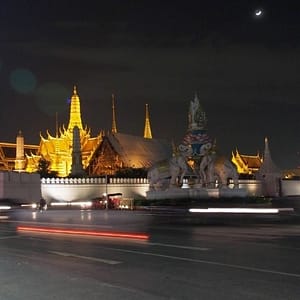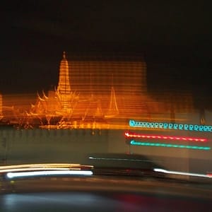 Ohúrení večerným BKK fotíme kráľovský palác a lokálnu trafiku. Využívame lístok do chrámu (Wat Suthat) a vchádzame za spevu modlitieb do večernej tmy. Na námestí pozorujeme cvičiace decká a už podľa GPS ideme domov. Na centrálom kruháči sa derieme hordou spievajúcich manifestantov, nechápeme čo je to za akciu, ale všetci vyzerajú nadšene.