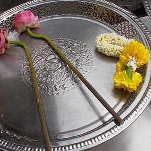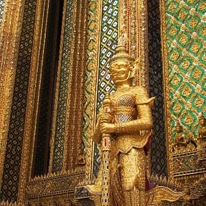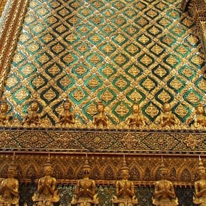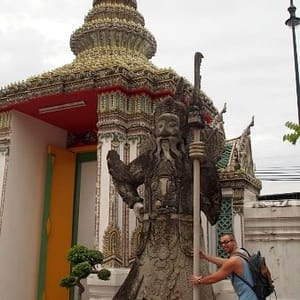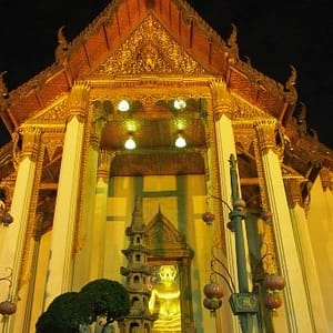 Zastavíme sa v prvom chráme na ktorý narazíme (Wat Suthat), celkom sa nám páči. Zlato matní, zlato lesklí a čierni Budhovia a na nás usmievajú pod strechou pravidelného štvorcového námestíčka, niektorí domorodci tu driemu v obednej korúčave. Vchádzame pozdraviť sochu centrálneho Budhu. Pred chrámom pália veriaci vonné tyčinky, sviečky a do váz vkladajú lotosové kvety.