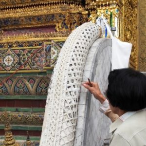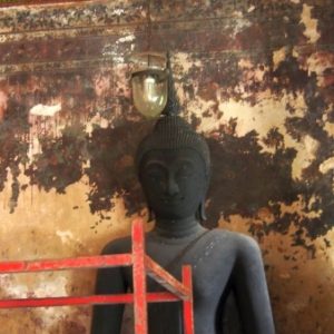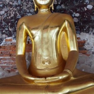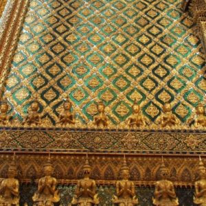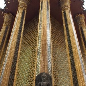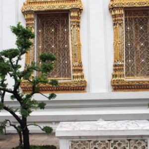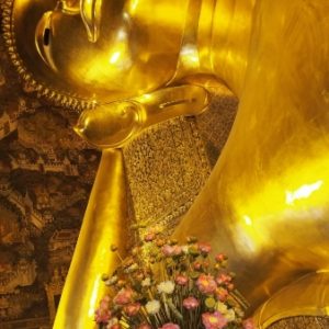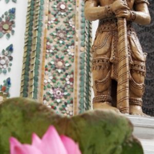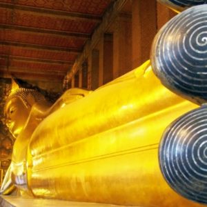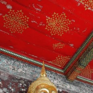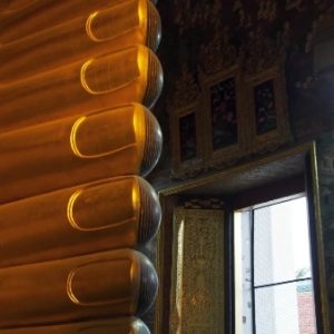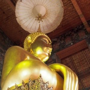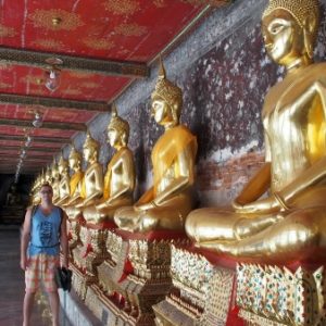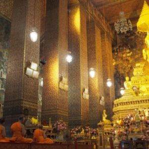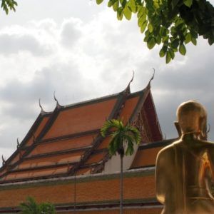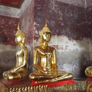 Zastavíme sa v prvom chráme na ktorý narazíme (Wat Suthat), celkom sa nám páči. Zlato matní, zlato lesklí a čierni Budhovia a na nás usmievajú pod strechou pravidelného štvorcového námestíčka, niektorí domorodci tu driemu v obednej korúčave. Vchádzame pozdraviť sochu centrálneho Budhu. Pred chrámom pália veriaci vonné tyčinky, sviečky a do váz vkladajú lotosové kvety.