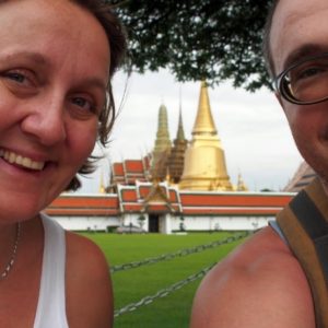 Na letisku nás tetuška prekvapila tým, že od nás chcela dôkaz opustenia Thajska do 30 dní od príletu. Ten sme samozrejme nemali. Spiatočná letenka je o 4 mesiace a pozemnú dopravu smerom do ďaľšieho štátu plánujeme operatívne riešiť na mieste. Poslala nás do okienka oproti, kde nám chlapík vystavil formálne prebookovanie (dúfam, že letenku naozaj nezmenil – tvrdil, že nie), vystáli sme si druhý krát šóru na check – in a bolo. Oslávili sme to prossecom.