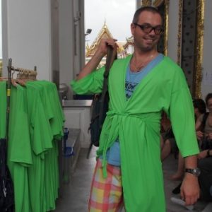 Lokálny spasiteľ (otravovač) nás informuje o tom, že sme nevhodne oblečení, všetko sa ale rieši samo, lebo v cene 500B (astronomickej na miestne pomery – LP z 2012 ešte píše o 350B) je aj oblečenie – prezlečenie. Dokonca aj K si musí dať košielku, lebo šatka cez tielko nestačí. Niekto predo mnou mal celkom príjemný deodorant, čo je síce fajn, lebo ja som si zabudol dať svoj, ale na druhej strane ma to až tak neteší, vedieť, že to nebolo ani opraté po predchádzajucom návštevníkovi. Všade sú hordy turistov, väčšina je ale „normálne oblečená“, takže si asi doniesli vhodné vlastné oblečenie.
