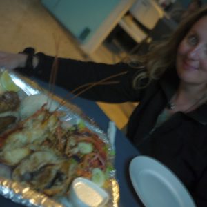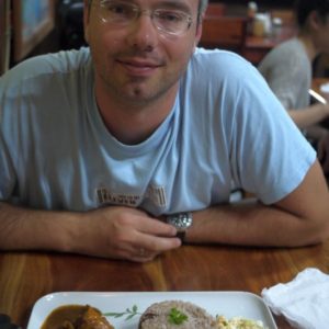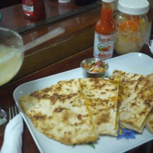 Pýtame sa domácich na jedlo a po kratšom hľadaní s kukuričnou zmrzkou zapadáme v Hanna´s. Dávame pol quesadily syrovej a pol hovädzej, k tomu fazule s ryžou a kura. Oňuchávam niečo čo vyzerá ako kvasená zelenina vo veľkom plastovom pohári a podľa pachu usudzujem, ze to bude štipľavé ako šľak. Donesú jedlo a quesadila je úplne famózna, ale horúca. Tak si krátim čas nakladaním kvasenej zeleniny na ryžu. A aj si jej rovno naložím plne ústa.
