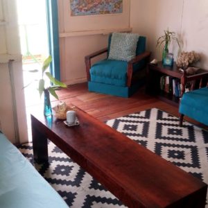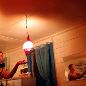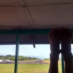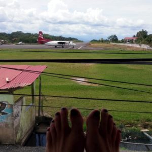 Tak žiaľbohu naša izba už na dnes nie je voľná a jediná alternatíva čo nám Jenny ponúka je za $31. O pôžičke 1.5USD nič nevie, ale príde jej to ako dobrý ofajč. Je ochotná ísť so mnou v strate napoly. To odmietnem, ale spýtam sa, či má pre nás welcome drinky, na ktoré vďaka nášmu genius statusu na booking.com máme nárok. Iba sa začuduje, že či to tam na ešte stále má. Keď zarmútený odchádzam ponúkne mi malinovku z chladničky. Dúfal som v niečo tuhšie a tak na otázku, či chcem obe odpoviem, že stačí jedna. Je to ginger ale – použijeme ho neskôr ten deň do sangrie. 31USD za izbu sa nám zdá trochu zbytočné a tak si rezervujeme izbu vo Vista Pista na booking.com. Keď sa odubytovávam, zbadám v zozname víl u Jenny na stene aj Vista Pista. Pre istotu si ešte pred barákom skontrolujem emaily aby sme nechodili hore a dole v teple dňa. Zbehnem späť na recepciu, kde mi povedia, že izba by už mohla byť hotová. Je už 11hodín – odubytovacia hodina a my máme pred sebou presun po slnku s extra 15kg vody. Radšej na to ani nemyslím. Našťastie dostane K geniálny nápad a vloží celú bandasku s vodou do záložného ruxaku, ktorý so sebou celý čas vláčime. Celí dopotení dorazíme k domu s ceduľkou, že si máme prečítať inštrukcie v emaili. Heslo na wifinu je z druhej strany. Ja som mal email už naštudovaný, ale páči sa mi, ako sofistikovane to majú spravené. V emaili je heslo do trezoru pod schodami, kde sú uložené kľúče od izieb. Vo vnútri v spoločenskej miestnosti spojenej s kuchyňou posedávajú nemeckí jetsetteri. Na chodbe sú izby 1 a 2 a jedny neoznačené dvere, kam sa neviem dostať. Idem si teda sadnúť k Nemcom a K napadne vyjsť na terasu, kde odomkne dvere s číslom 3. Máme parádnu veľkú izbu a je tu dokonca aj klíma. Terasa má ešte vlastné dvere, fajné sedenie a parádny výhľad na letisko, ktoré od nášho domu oddeľuje len futbalové ihrisko na šírku, priekopa a nespevnená cesta.