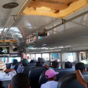 Pred stanicou sa musíme predierať zápchou, lebo po ceste pochodujú kadejaké hudobné skupiny. Na stanici, ktorá vyzerá dosť slabo, majú prekvapivo aj Mekes. My sa ale uspokojíme s posledným panamským pivkom a v rozpadajúcom sa školskom buse z USA s mega telkou ideme na hranicu.