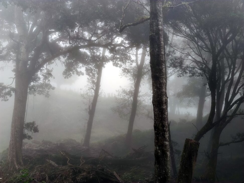 Ponárame sa do hmly a začína mrholiť. Dole, kde nás ráno vyhodil taxík čakáme na mikrobus asi 10 minút. Ideme rovno na obed a tam nás chytí už seriózny dážď. Potom už len leje a leje a leje do večera, celú noc a celý deň. Perfektne nám to vyšlo. Tropická búrka uzavrie všetky cesty ani po okolí sa nedá chodiť. Ani noví turisti, čo mali našu izbu rezervovanú neprídu.