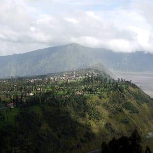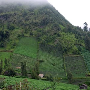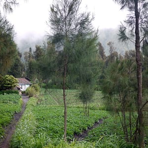 Posilnení ryžou sa vyberieme na výhľad na Bromo. Oblaky a hmla nám síce znemožnia výhľad, ak výjdeme moc vysoko, ale veď možno až tak vysoko nevýjdeme. Ideme vychádzkovým tempom asfaltkou pomedzi cibuľové a zemiakové polia. Domčeky sú stále redšie a jednoduchšie, cesta je čím ďalej strmšia. Je pod mrakom, občas sme na vetre. Stretávame rozjareného Nemca, čo zostal ubytovaný v pekidžovom hosteli 4km pod dedinou.