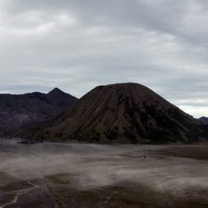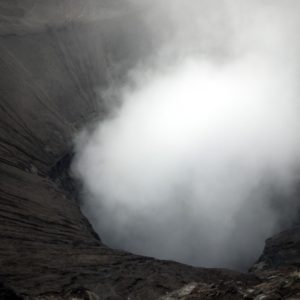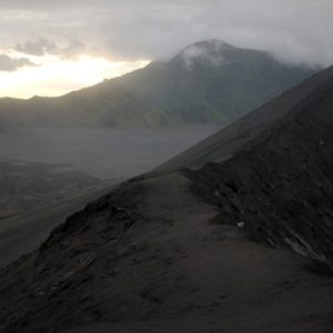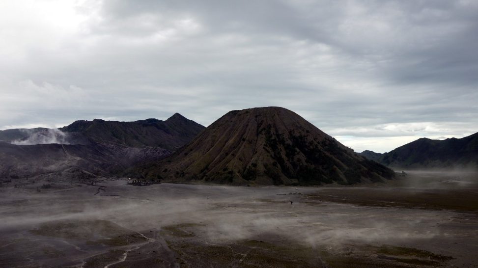 Keď sa oblaky na chvíľu roztiahnu cvakáme výhľad telefónom a zdieľame s ľudmi čo sú online na Viberi. Zdá sa, že oblaky sa trochu zdvihli, tak pokračujeme po teraz už trošku rozbitejšej asfaltke smerom nahor. Všade navôkol su parádne výhľady. Vyzerá to, že kaldera, z hrany ktorej sme cez obed pozerali na kráter je vnútri väčšej kaldery – aj s nami. A my sa teraz vlastne zvnútra štveráme na hranu tej vonkajšej. V knižke čítame, že kaldera má 10km priemer, ale nevieme, ktorá, asi tá vonkajšia. Kaldera je prepadnutá sopka. Kužeľ spadne dovnútra a nedá sa už hovoriť o kráteri. V našom prípade je v „malej“ kaldere kráter Bromo a pekný malý kužeľ sopky vedľa. Viac toho už nevidíme. Kaldera je vnútri plochá, pokrytá sopečným pieskom, trčí z nej len už spomínaný kráter a kužeľ. Za tým sa ešte niečo črtá, ale to je zväčša v oblakoch.