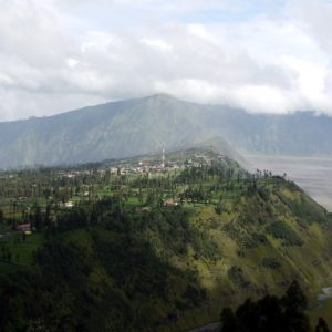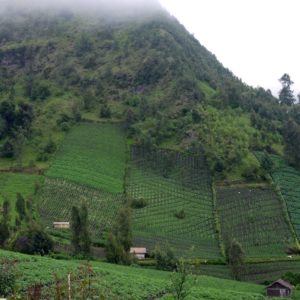 Posilnení ryžou sa vyberieme na výhľad na Bromo. Oblaky a hmla nám síce znemožnia výhľad, ak výjdeme moc vysoko, ale veď možno až tak vysoko nevýjdeme. Ideme vychádzkovým tempom asfaltkou pomedzi cibuľové a zemiakové polia. Domčeky sú stále redšie a jednoduchšie, cesta je čím ďalej strmšia. Je pod mrakom, občas sme na vetre. Stretávame rozjareného Nemca, čo zostal ubytovaný v pekidžovom hosteli 4km pod dedinou.