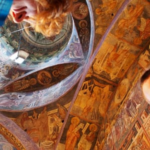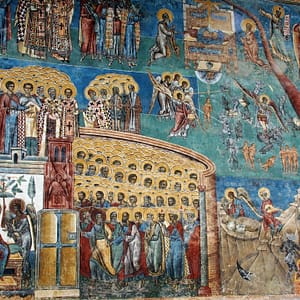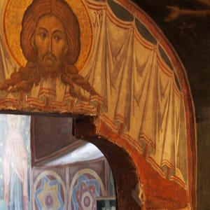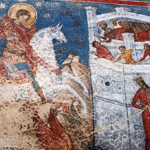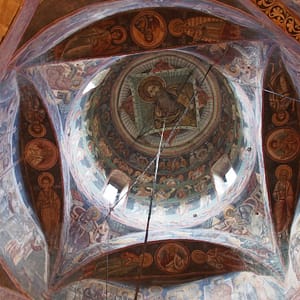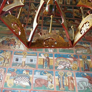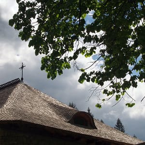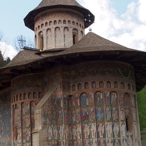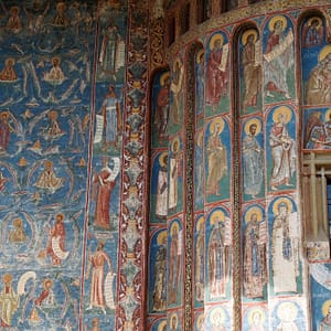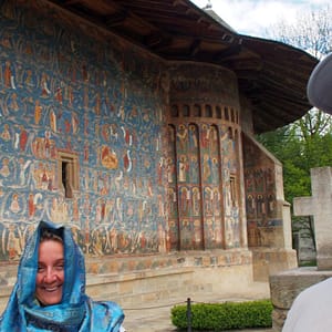 Cestou sú maľované kostoly a tak sa v jednom zastavíme. Tiež slušne rozbitá cesta v dedine – ako to plynofikovali. Platíme aj za parkovanie. Kostol je ale fantastický. Celý je pomaľovaný a z farieb dominuje nádherná lapis azuli modrá. Ideme dnu, kde sú maľovky zrekonštruované do perfektného stavu, no začne sa tam hrnúť autobus rôznorodých turistov, tak zdrhneme von. Chceli sme si robiť piknik, no nie je to tu moc reálne, tak len posrkávame vínko a počúvame rádovú sestru ako autobusu turistov vysvetľuje niečo z histórie. Piknikujeme až na parkovisku a ideme pozrieť ďalší kostol. Ten by mal byť dočervena. A aj je, ale nie je ani zďaleka tak dobre zachovaný. Tri štvrtiny vonkajších stien sú biele. Vyrazíme smer Moldavsko, že prejdeme ešte ňáke tie kilometre, kým bude tma. Nech sme zajtra čo najskôr na hraniciach. Nikde cestou ale nič zaujímavé na spatie nenájdeme, tak to zapichneme kúsok od hraníc za opustenú benzínku.