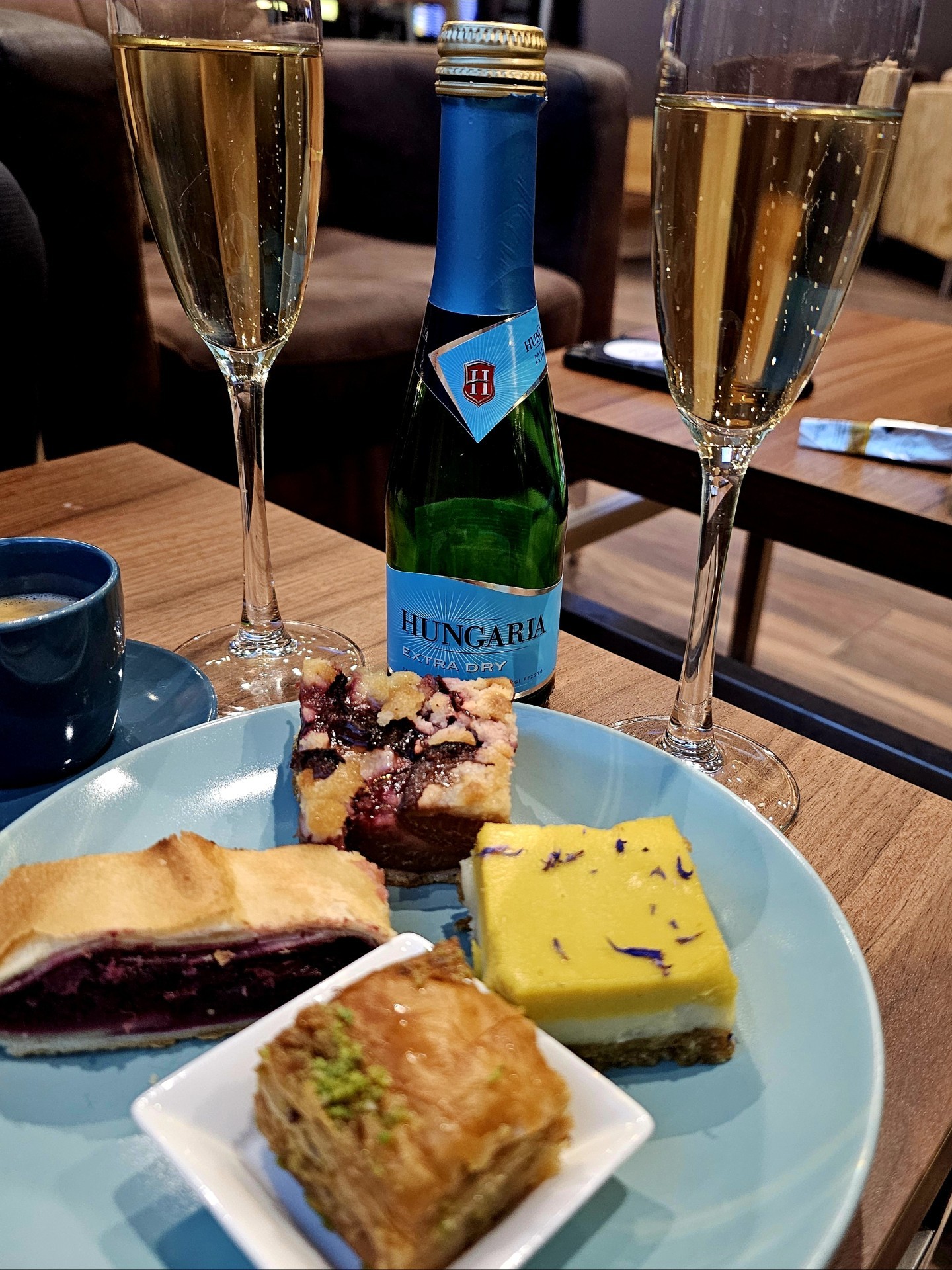 Nejakým zázrakom Katka klikla na niečo v Trip.com appke a dostali sme zadarmo VIP Lounge v Budapešti. Bolo to fajn. Z jednej nás poslali do prdele, že máme ísť najprv cez kontrolu pasov a potom tam bude druhá. Asi sme boli v EU lounge. Tak sme prešli pasovou kontrolou a našli sme si lounge znova. Tam bol studený raňajkový bufet, bolo však predsa len dosť zavčasu, ale mali aj malé šumivé vína Hungaria robené tradičnou metódou sekundárnej fermentácie vo fľaši (ako šampanské) a aj Bombay Gin. Problém bol, že sme boli ešte rozospatí a ani som nevedel nájst tonik. Katke to ale už pálilo a odporučila, aby som pozrel mašinu na nealko. Moc sme to ale takto ráno nedali. Dokonca ani pivo som nemal. Úplná tragédia.