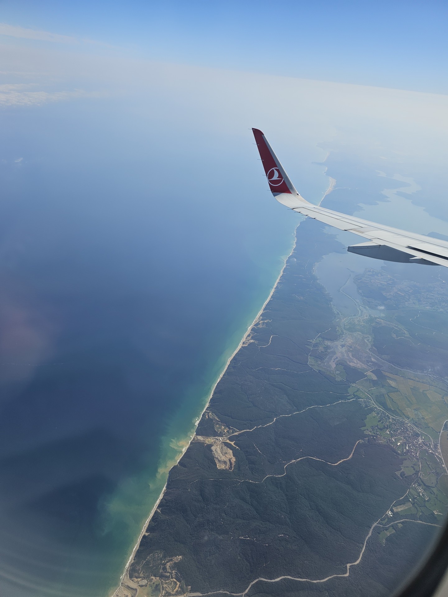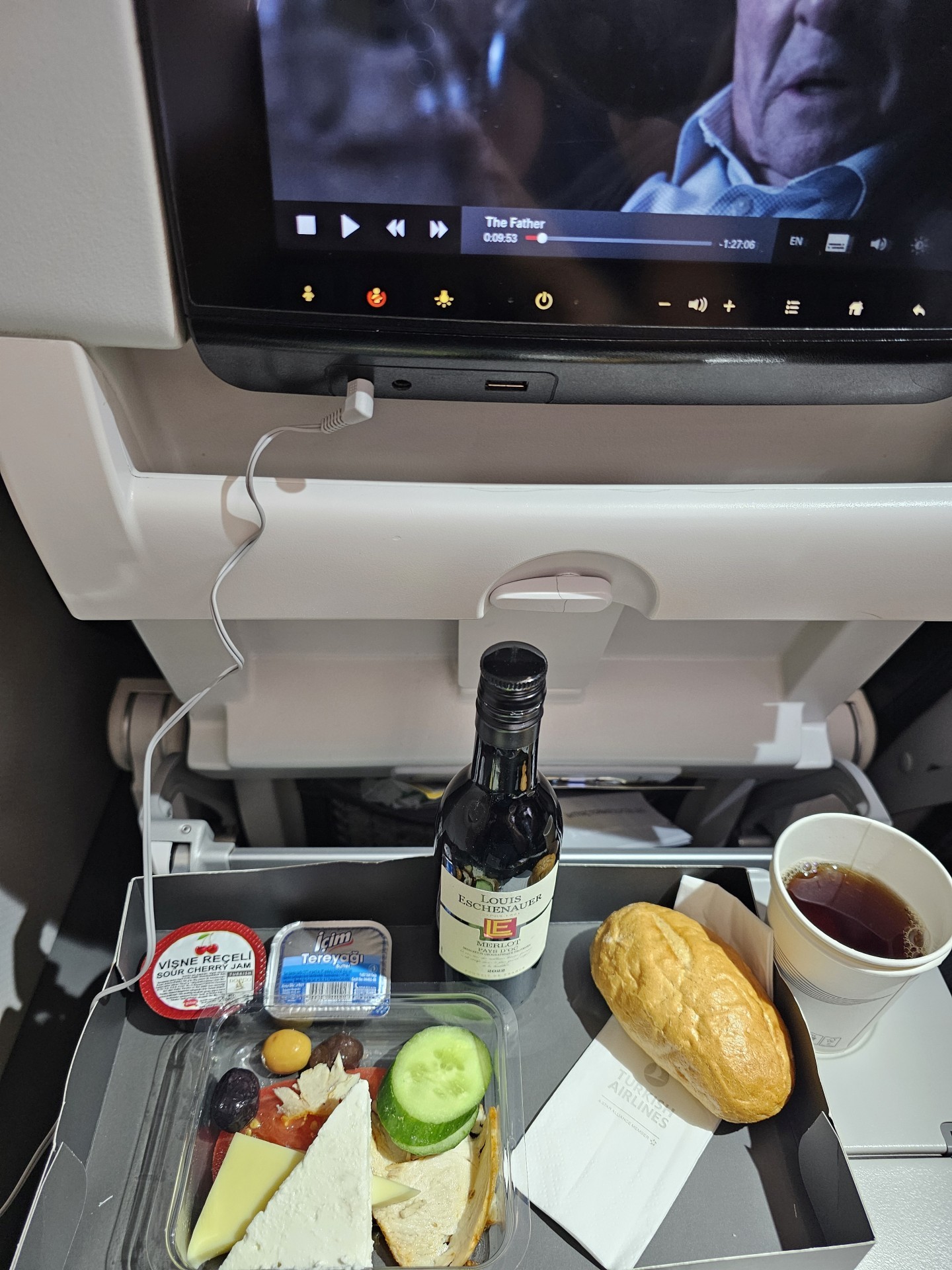 Letíme Turkish airlines a tí majú dobré vínko i raňajky. S tým druhým celkom bojujeme, lebo však sme ešte celkom najedení.