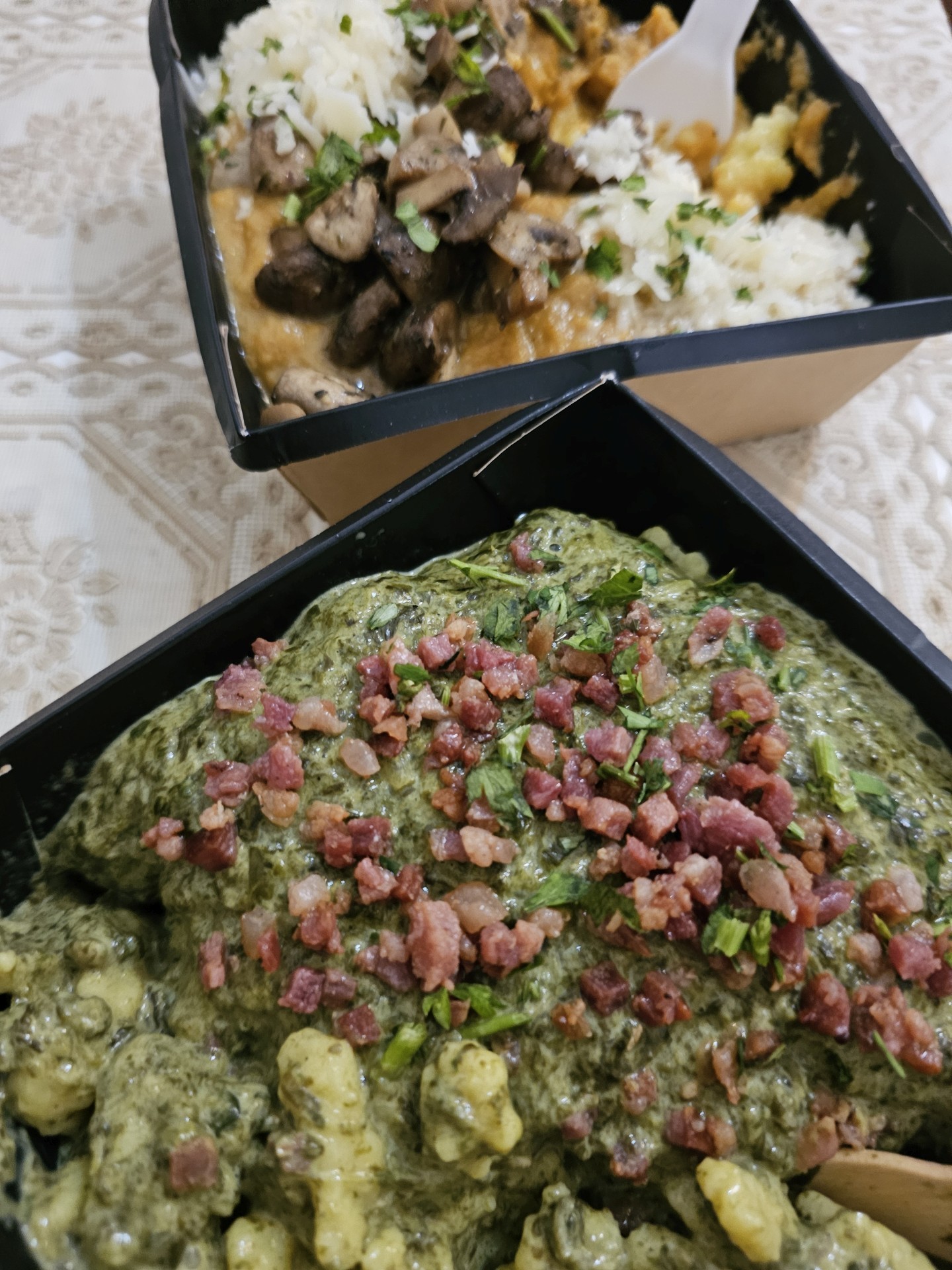Na večeru si v hipsterskom podniku neďaleko dávame maďarské halušky. Sú to také, aké sa u nás robia s perkeltom. Tu na to majú kadejaké omáčky, čo idú navrch. Necháme si poradiť a keďže je už clkom zima, bereme ich na izbu. Jedny sú špenátové so slaninkou a druhé červená smotanová (perkeltová) omáčka s hubami. Je to celkom fajn, a napriek tomu, ze štvorcové misky vyzerajú byť malé, jedla je nakoniec až až.