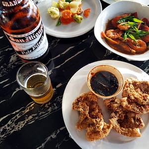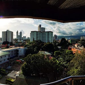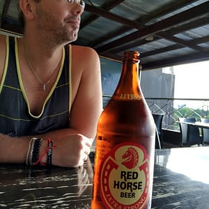 Zmôžeme sa na jediné jedlo o 15.30 na terase na 5tom poschodí. Výhľad je parádny, zelené rozorvané kopce v diaľke vyzerajú ako na Havaji. Mesto pred nami je zaplavené zeleňou a sem tam trčí vyšší dom. Objednáme si litrové pivo, no čašníčka zmizne a už sa nevráti, tak skúšame ešte u chlápka, čo upratuje stoličky. S tým to klapne. Pocuckávame Červeného Koňa (Red Horse – silné filipínske pivo), kocháme sa výhľadom a dramatickými oblakmi a čakáme a čakáme.