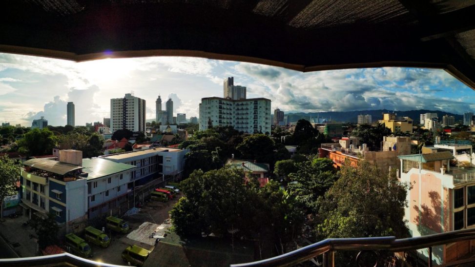 Zmôžeme sa na jediné jedlo o 15.30 na terase na 5tom poschodí. Výhľad je parádny, zelené rozorvané kopce v diaľke vyzerajú ako na Havaji. Mesto pred nami je zaplavené zeleňou a sem tam trčí vyšší dom. Objednáme si litrové pivo, no čašníčka zmizne a už sa nevráti, tak skúšame ešte u chlápka, čo upratuje stoličky. S tým to klapne. Pocuckávame Červeného Koňa (Red Horse – silné filipínske pivo), kocháme sa výhľadom a dramatickými oblakmi a čakáme a čakáme.