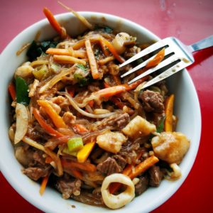 Cestou cez komplex nájdeme aj domáci supermarket. Tiež je tam veľa importovaného, ale menej luxusného. Z toho všetkého chodenia nám vytrávilo, tak sa prejdeme do krásnej záhrady s reštauráciami. Na troch poschodiach všade navôkol ich je toľko, že si nevieme vybrať. Hlad nás ale donúti a zapadáme do mongolského grilu. Tu si človek naberá do pridelenej misky surové ingrediencie, ktoré mu potom uvaria. Majú aj možnosť (lacnejšiu) zafajkať želania na papierik a obsluha to všetko urobí. Iná možnosť je bufet – všetko čo zješ. Tu ale treba vždy dojesť misku, inak ju bude treba doplatiť.