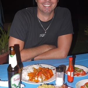 Nakoniec sme to ale prežili, vylodili sa a nasledovali Fluvia do hotela, ktorý už mal vyzistený. Zle sme odbočili, resp. sme neodbočili, kde sme mali, tak sme došli až na letisko. Tam sme sa otočili a po ďalších 10 minútach šlapania sme šli okolo roztomilej pláži s hotelom za $10 na noc. Ja som ešte stále cítil rozhrkaný žalúdok a aj som mal dosť teperenie sa s vakom, tak som sa tam rovno zložil. Pláž bola úplne super, hneď cez nedláždenú cestičku, cena bola fajn, tak reku, že nech si idú ďalej to pozreť, ja ich počkám. A aj sa Katka s Fluviom vrátili, cena už bola medzičasom 15 dolárov, tak sme zostali na mojom mieste. Po kúpaní a sprche sme sa s Fluviom dohodli, že pôjdeme na lobstera. On mal info, že kde ho majú najlacnejšieho za 150 cordobas. V jedinej reštike, ktorú sme čekli ho mali za 330, tak sme zobrali taxíkza 15C každý a poď ho na cestu okolo ostrova. Taxikár nas vyložili pred podnikom a zdrhol skôr ako sme zistili, že kuchár je na dovolenke a celý týždeň sa nevarí. Pekne. Tak sme šlapali chvíľu, až sme na autobusovej zastávke narazili na taxikára, ktorý nás zobral do ním odporučeného podniku. Tam mali lobstera za 250, čo bolo o 50 viac, ako písali ešte v decembri na tripadvisore, ale bol fakt super. Ja som ho mal s kokosovou omáčkou a bol božský. Katke chutil jej cesnakový viac, mne zase môj. Babka sa s nami aj povyprávala, že ako kedysi robila na Kaymanských ostrovoch a ako je ťažké sa tam dostať. Do tretice nás zobral taxík domov, po ceste sme sa ešte zastavili v nejakom bare a menili šóféra pred jeho domom, a keď sme už boli takí pozastavovaní, poprosili sme šoféra, nech zastane pred supermarketom na vodu. Odviezol nás potom inou cestou pred náš hotel, takže sme dokončili výletný okruh. Po tme sme si na našej vlastnej plážičke odpálili cigaru a s Fluviom zaspievali Boba Marleyho. Bol to nádherný večer s nohami namočenými vo vode.