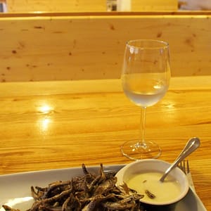 Katke sa podarilo kúpiť fajný koláčik, vyzerá to ako praclík a je to sladké skoro ako bakhlava. Bojím sa moc vzďaľovať od WC, tak sa ešte presunieme vedľa na malé pivko a pražené rybky. Trochu pracujeme offline.