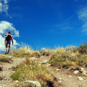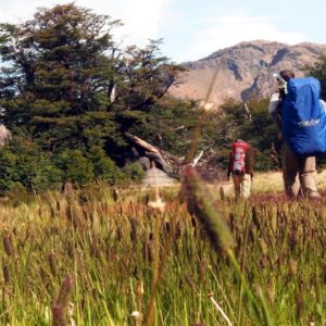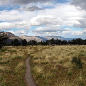Vyrážame okolo druhej. Cesta do kempu by mala trvať tri hodky a svetlo je do pol desiatej, takže pohoda. Asfaltkou prejdeme až na druhý koniec obce a vyrážame na Fitz Roy chodník. Nárazový vietor mnou a mojim 13kg vakom občas pekne zamáva. Najdrsnejšie je to na exponovaných a tenkých chodníkoch, keď sa míňame s niekým zhora. Zvolíme príjemné tempo, aby sme sa moc neupotili, keďže máme spať dve noci v spacáčiku.