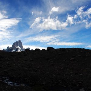 Už v noci mi bolo pri cikaní jasné, že bude pekne. Hviezdy žiarili pomedzi stromy a mesiac svietil ako brutálny reflektor upevnený na Fitz Royi. Celí šťastní si varíme maté a earl grey a raňajkujeme na slniečku v dolinke potôčika kam chodíme po vodu. Kocháme sa výhľadom a tajne dúfame, že príšerne vychodený chodník do strmého svahu medzi nami a Fitz Royom nie je tá vyhliadka, kam máme dnes namierené.