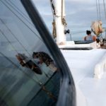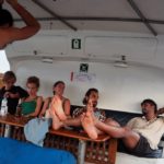 Na palube nás čaká olovrant v podobe pukancov, tak tam posedávame a kocháme sa západom slnka. Miláčik žien David, ktorý neviem či len na tejto lodi, sa dosť orientuje na staršie ženy, nemá plavky a tak chodieva plávať a šnorchľovať v boxerkách. Tieto magicky modré slipy s vtipnou popiskou sa sušia na zadnej palube, no nie sú moc uviazané, tak ich musia dámy (Helen) zachraňovať. Vznikne z toho vtipná prifarbená storka, ako ich Helen “chytila do zubov” a Katka ich potom demonštratívne zauzlí do lana, aby ich vietor neodfúkol, keď sa loď pohne.