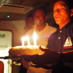 Na večeru je super ryba-marlin. Včera mali Helen s Gunnarom narodky (40, 30), dnes Jas (24), tak kuchár sa hecol a spravil im narodeninovú tortu. Vegán Gunnar si z nej dáva iba jablko. Oslávenci sfukujú sviečky, kým im my falošne ale s nadšením spievame Happy Birthday! Ja potom hneď fičím do kajuty a konečne si umývam zuby postojačky. Keď sa vrátim do jedálne, nikto tam už nie je, asik aj iní pochopili, že niektoré veci sa lepšie robia, keď je loď ukotvená.