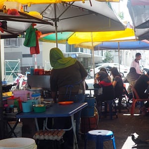 Ja som už dosť hladný, tak si v 7-Eleven kupujem detské kexíky za jeden Ringit a kúsok po ulici zapadneme na raňajkové nudličky v čínskej kaviarničke . Dáme si ich trocha štipľavé, ale viac by už nebolo treba. Ľadový čaj i káva sú super a ani nie moc sladké.