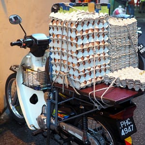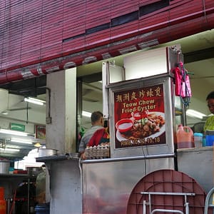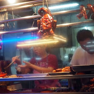 Na večeru hľadáme hawklers – stánky s čínskymi špecialitkami. Navigácia je ale neistá, tak sa cestou posilníme omeletkou s ustricami za 10. Mali ceny od 8 do 16, tak sme vybrali to, čo pani ponúkla. Keď rozohrievali wok, z ohňa pod ním lietali na ulicu iskry. Ustrice boli mäkunké, priam sa rozplývali na jazyku. Vo vajci boli zapražené širšie ryžové rezance.