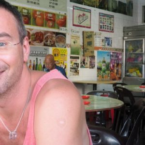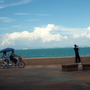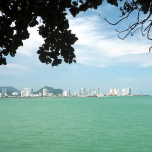 Premávka je taká súvislá, že často nevieme prejsť cez cestu. Pešie chodníky takmer neexistujú a keď sú, bežne sú blokované stánkami alebo motorkami. Obedík si nakoniec zadelíme na nábreží s výhľadom na krásne more a mrakodrapy – ako v Paname. Dáme fajnú veľkú praženú ryžu so zeleninou za 5 Ringit, kocháme sa výhľadom a chladíme vetríkom. V prístave konečne pochopíme, prečo je tu toľko postarších bielych párov. Sú to pasažieri velikej výletnej lode, čo už včera svietila v prístave.