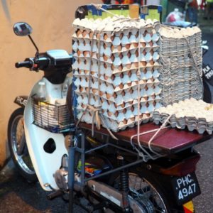 Na večeru hľadáme hawklers – stánky s čínskymi špecialitkami. Navigácia je ale neistá, tak sa cestou posilníme omeletkou s ustricami za 10. Mali ceny od 8 do 16, tak sme vybrali to, čo pani ponúkla. Keď rozohrievali wok, z ohňa pod ním lietali na ulicu iskry. Ustrice boli mäkunké, priam sa rozplývali na jazyku. Vo vajci boli zapražené širšie ryžové rezance.