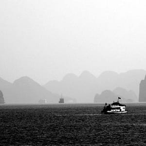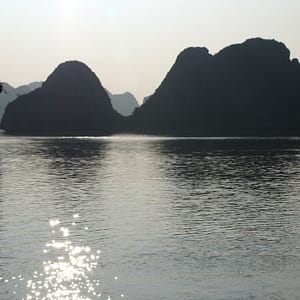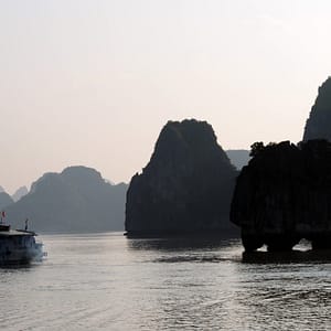 Po hotelových raňajkách netrpezlivo vyčkávame na odvoz. Príde minibus a nastupujeme do už skoro úplne plného vozidla. Berieme ešte jednu dvojicu pri katedrále a motkáme sa premávkou von z mesta. Po niečo cez hodinu zastavujeme v turistickej pasci s veľkým množstvom suvenírov, trochou alkoholu, malinoviek a čerstvého ovocia za 20000D. Tam stojíme 30 minút a čakáme, kým sa objaví náš minibusík. Po ďalších dvoch hodinách sme konečne v prístave. Narýchlo cez cestu nakupujem plechovky nealka k bielemu rumu z Filipín a po 15 minutách postávania sa naloďujeme. Hneď na úvod sa zoznamujeme s pravidlami. Pravidlo číso jedna: pitie prineseného alkoholu je zakázane. Super. Ešte že máme len litrovku rumu a fľašu červeného, ktoré sme sem zbytočne niesli. Ideme rovno obedovať. Sedíme v jedálenskej sekcii loďe, za stolom s ďaľšími dvoma pármi. Frantíci a Kanaďanka s Frantíkom. Po jedle vystupujeme pred jaskyňou. Po nenáročnom výstupe sa spolu s desiatkami ľudí z desiatok lodí ponárame do ozrutnej jaskyne Thien Cung až gýčovo prisvietenej farebnými svetlami. Chodíme po chodníku vedúcom celou jaskyňou hádam aj 20 minút. Je veliká, ale nejaká moc suchá, miestami sa až moc podobá na vybetónované schodisko, takže pôsobí trošku umelo. Napriek veľkosti nie je moc „oslnivá“. Z horného východu jaskyne máme výhľad na celú zátoku. Zostupujeme dole a pri záchodoch sa ma sprievodca Jerry pýta, či by sme radšej nespali na ostrove ako na lodi, lebo je veľká zima. Zahrám to, že sa poradím s manželkou. Moc sa mi to nepozdáva. Zrejme sme prebookovaní – loď vezie viac pasažierov ako je na nej postelí. Nalodíme sa a presúvame sa do kajakovej dediny – niekoľko domčekov s plávajúcimi plochami pozbíjanými z dosák. Vystúpime, prejdeme z barovej do kajakovej časti, kde nafasujeme mokré vesty, nasadneme do kajakov a poď ho objavovať skaliská. Nasledujeme česky hovoriaci párik von zo zátoky, cestou križujeme veľkú loď, ktorá na nás aj trúbi. Nevieme sa dohodnúť prečo. Je zima, ale po chvíi veslovania na slniečku mi je celkom teplo. K fotí a ja zaberám. Vyberieme sa okolo veľkého ostrova, no v polovici to otočíme, lebo očividne vyzerá väčší ako sa zdal zpredu a v tieni je fakt zima. Vraciame sa a obiehame ho z druhej strany, po slniečku. Čas na člnkovanie sa pomaly kráti, tak sa vyberieme späť a šibneme to popod skalný útvar. Je to magické. Stojí akoby na nožičkách. Oproti nám idú experti, ktorí nevyzerajú že by vedeli dobre kormidlovať, tak sa im radšej vyhneme. Cez skalnú bránu to ale nedajú, lebo ich spoza nás niekto zaháňa, že je to zakázané. Fajne, zase sme raz boli v zákaze. To sme celí my. Do prístavu priplávame predposlení, ja som medzičasom celý povyzliekaný a pekne rozhriaty.