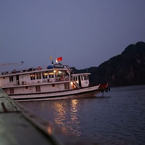 Trochu sa ideme zohriať na izbu a na večeru nás čakajú spojené stoly a kadejaké špecialitky. Máme aj kusy ryby chutiace ako údenáče. Jedlo je inak dosť vegetárianské, čo nám nevadí a pri cene za výlet už vôbec nie. Po večeri ešte obdivujeme zore z vrchnej paluby. Je tu veľký kľud a pohoda. Ticho, hviezdy, posledné stopy svetla. Na jednej strane sa pokojne hojdá dedinka, okolo nás sa postupne hromadia ďalšie lode a pripravujú sa na spánok. Chlad nás ale vyženie do tepla, a tam sa v jedálni pri hlasnej disko hudbe bavíme s Thajcom a Moravákmi (Patrik a Tamara). Z Thajca si robíme srandu, že má 5 dní dovolenku, a príde z teplého Thajska do studeného severného Vietnamu ako ťupík. Chlapík sa stále sam fotí ako čínsky turista. Už aj v buse sa fotil. Moravskí bratia nás ešte pohostia slivovicou a ideme okolo 22:00 spať ako medzi poslednými.