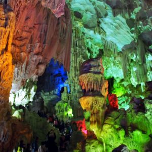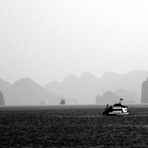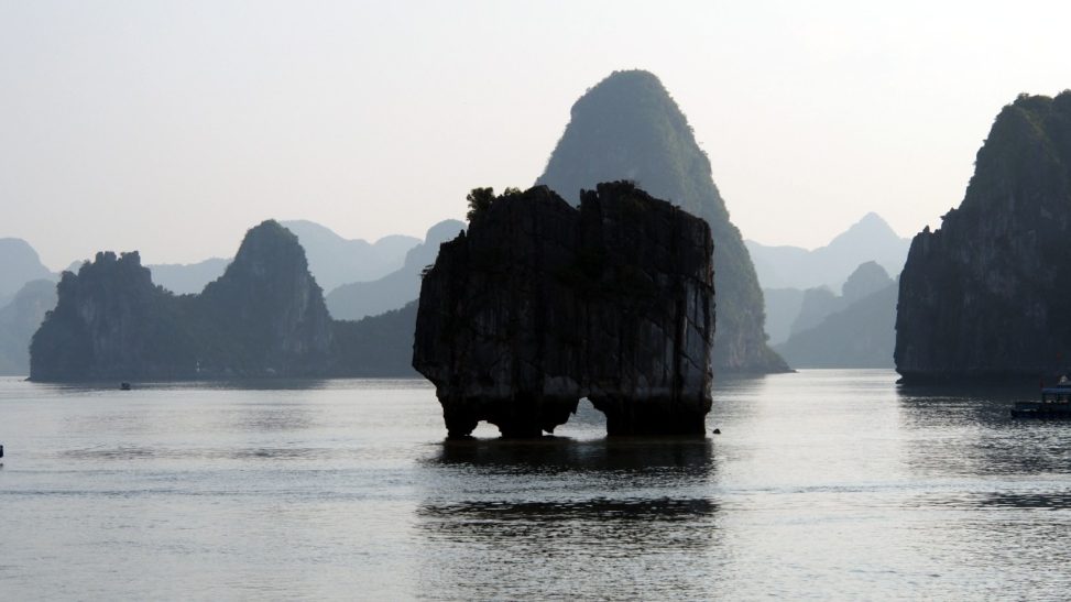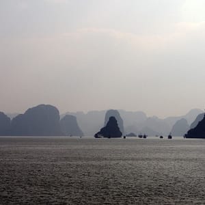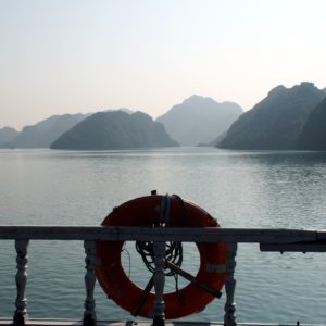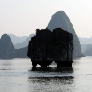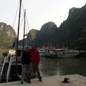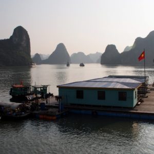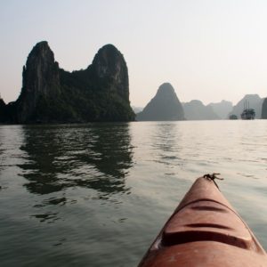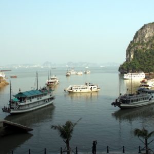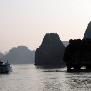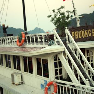 Po hotelových raňajkách netrpezlivo vyčkávame na odvoz. Príde minibus a nastupujeme do už skoro úplne plného vozidla. Berieme ešte jednu dvojicu pri katedrále a motkáme sa premávkou von z mesta. Po niečo cez hodinu zastavujeme v turistickej pasci s veľkým množstvom suvenírov, trochou alkoholu, malinoviek a čerstvého ovocia za 20000D. Tam stojíme 30 minút a čakáme, kým sa objaví náš minibusík. Po ďalších dvoch hodinách sme konečne v prístave. Narýchlo cez cestu nakupujem plechovky nealka k bielemu rumu z Filipín a po 15 minutách postávania sa naloďujeme. Hneď na úvod sa zoznamujeme s pravidlami. Pravidlo číso jedna: pitie prineseného alkoholu je zakázane. Super. Ešte že máme len litrovku rumu a fľašu červeného, ktoré sme sem zbytočne niesli. Ideme rovno obedovať. Sedíme v jedálenskej sekcii loďe, za stolom s ďaľšími dvoma pármi. Frantíci a Kanaďanka s Frantíkom. Po jedle vystupujeme pred jaskyňou. Po nenáročnom výstupe sa spolu s desiatkami ľudí z desiatok lodí ponárame do ozrutnej jaskyne Thien Cung až gýčovo prisvietenej farebnými svetlami. Chodíme po chodníku vedúcom celou jaskyňou hádam aj 20 minút. Je veliká, ale nejaká moc suchá, miestami sa až moc podobá na vybetónované schodisko, takže pôsobí trošku umelo. Napriek veľkosti nie je moc „oslnivá“. Z horného východu jaskyne máme výhľad na celú zátoku. Zostupujeme dole a pri záchodoch sa ma sprievodca Jerry pýta, či by sme radšej nespali na ostrove ako na lodi, lebo je veľká zima. Zahrám to, že sa poradím s manželkou. Moc sa mi to nepozdáva. Zrejme sme prebookovaní – loď vezie viac pasažierov ako je na nej postelí. Nalodíme sa a presúvame sa do kajakovej dediny – niekoľko domčekov s plávajúcimi plochami pozbíjanými z dosák. Vystúpime, prejdeme z barovej do kajakovej časti, kde nafasujeme mokré vesty, nasadneme do kajakov a poď ho objavovať skaliská. Nasledujeme česky hovoriaci párik von zo zátoky, cestou križujeme veľkú loď, ktorá na nás aj trúbi. Nevieme sa dohodnúť prečo. Je zima, ale po chvíi veslovania na slniečku mi je celkom teplo. K fotí a ja zaberám. Vyberieme sa okolo veľkého ostrova, no v polovici to otočíme, lebo očividne vyzerá väčší ako sa zdal zpredu a v tieni je fakt zima. Vraciame sa a obiehame ho z druhej strany, po slniečku. Čas na člnkovanie sa pomaly kráti, tak sa vyberieme späť a šibneme to popod skalný útvar. Je to magické. Stojí akoby na nožičkách. Oproti nám idú experti, ktorí nevyzerajú že by vedeli dobre kormidlovať, tak sa im radšej vyhneme. Cez skalnú bránu to ale nedajú, lebo ich spoza nás niekto zaháňa, že je to zakázané. Fajne, zase sme raz boli v zákaze. To sme celí my. Do prístavu priplávame predposlení, ja som medzičasom celý povyzliekaný a pekne rozhriaty.