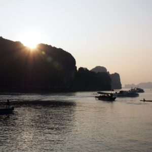 Trochu sa ideme zohriať na izbu a na večeru nás čakajú spojené stoly a kadejaké špecialitky. Máme aj kusy ryby chutiace ako údenáče. Jedlo je inak dosť vegetárianské, čo nám nevadí a pri cene za výlet už vôbec nie. Po večeri ešte obdivujeme zore z vrchnej paluby. Je tu veľký kľud a pohoda. Ticho, hviezdy, posledné stopy svetla. Na jednej strane sa pokojne hojdá dedinka, okolo nás sa postupne hromadia ďalšie lode a pripravujú sa na spánok. Chlad nás ale vyženie do tepla, a tam sa v jedálni pri hlasnej disko hudbe bavíme s Thajcom a Moravákmi (Patrik a Tamara). Z Thajca si robíme srandu, že má 5 dní dovolenku, a príde z teplého Thajska do studeného severného Vietnamu ako ťupík. Chlapík sa stále sam fotí ako čínsky turista. Už aj v buse sa fotil. Moravskí bratia nás ešte pohostia slivovicou a ideme okolo 22:00 spať ako medzi poslednými.