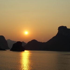 Smerujeme na ostrov Cat Bay. Kapi (kapitán) nám prideľuje kajutky. Šikuľka K nafasovala najsamlepšiu. Kúsok od jedálne, ani nie prvú pri reprákoch, ani nie poslednú ďaleko a nad motorom. Z kajuty som úplne paf. Lepší štandard ako hoteli čo mávame, z postele vidno pekne von okienkom na skaly, a dokonca vraj bude okolo 18:00 aj teplá voda. V tejto zime ale vôbec nemám potrebu sa sprchovať, takže teplá voda ma najmej trápi. Od radosti z parádnej izby si otvoríme rum a pár hltov spláchneme pepsi. Na bare si dávam pivko (35000D) a K sa pridáva k babám s objednáva si ginový zázrak (60000D). Gin s cukrom a citrónom až taký zázračný nebol, ale západ slnka z paluby bol úchvatný. Dokonca ako sa plavíme výde slnko dvakrát do boku. Až mám pocit, že to bude tým rumom. Rum hreje, pivko som si ešte ani neotvoril a ani sa v tej zime neponáhľam. Bavíme sa s Austrálčanmi a pomaly priplávame k hlavnému ostrovu. Tam sa lúčime s časťou posádky, ktorá tam trávi noc a vykladáme aj nasrdeného Inda, ktorý tam chcel byt 13:30 a pritom je 17:30. Nakladáme nemecký párik, čo bude spať na lodi. Cekom sranda, koľko ľudí sa cez tú loď premelie.