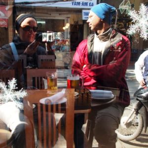 Vyzerá to na teplo (apsoň teda na slnku) a je to aj najlacnejšie, tak sa osmelíme na pivká. Donesú nám dve 6 decové, každé stojí 35 000D. Drobné prekvapenie nastane pri platení v podobe 10% dani (sktorou sme sa ešte nestretli). Miesta na slnku sú obsadené, tak si prisadneme k slečne netbookom. Časom sa rozbehne konverzácia. Slečinka je z Francúzska, prišla sem po školách (právo) učiť na pól roka francúzštinu, no ušla sa jej najmä angličtina. Žartujem, aký to bude úlet ak nejaký turista osloví jej žiaka a ten mu odpovie anglicky s francúzskym prízvukom (ona ho teda má intenzívny). Hovorí, že vie o pár anglicky hovoriacich učiteľoch, ktorí učia francúzsky, takže tam to bude podobne vtipné. Zaujímavé je, že jej stará mama sa narodila vo Vietname, po oficiálnom ukončení kolonizácie sa ako 22 ročná dostala do Francúzska, do rodiska sa už nevrátila. Ani cesty do Vietnamu vnučky sa už nedožila. Zomrela pár mesiacov pred odchodom. Zvrtneme konverzáciu na jedlo a učiteľka sa rozhovorí o mačacom mäse (žuvačkové), potom pomenie ako zmizol psík z dvora, tak dva dni nejedla vôbec žiadne mäso. Ono je asi fakt lepšie keď človek netuší čo za mäso to je.