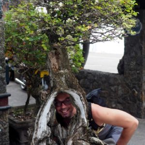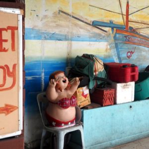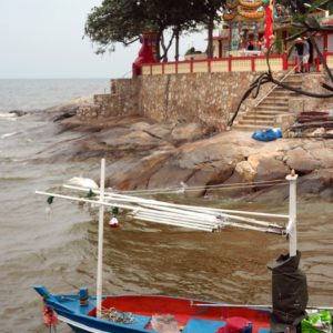 Chceme si dať obed ale všetko je už pozatvárane. Tak natrafíme v bočnej uličke na domáci podnik, kde nám Anglán zbehne po pivo zatiaľ čo jeho thajská manželka pripraví krevety na lahodných kešu orechoch a opekanú zeleninu. Kým čakáme popíjame pivko a pozeráme na zlaté miešané decko pod vedľajším stolom. Hrá sa s kávou vo vákuovom sáčku a je mu dobre. Domáci chovajú raky. Majú jedného velikého modrého. Je zatiahnuté, tak ideme pomaly na pláž. Tá začína pod megahotelom Hilton. Voda je teplá, príjemná no trošku sa doškrabem na skalách na dne. Úkaz dňa č.1 je drsný pán, belech v turbane a bielej košeli na koni ako sa stále natáča telefónom na selfiepaličke. Úkaz č.2 je celkom statný mladý Číňan ako dusá okolo na mikro poníkovi, veje mu hriva a za ním beží majiteľ poníka a vypiskuje na píšťalke.
