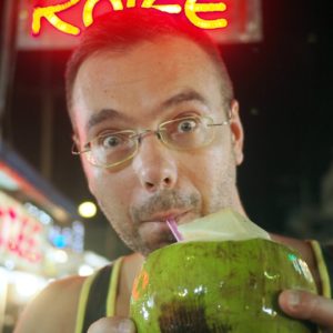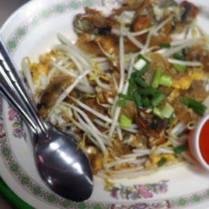 Tam kde včera dávame omeletku s mušlami a lahodné kuriatko na paličke s arašidovou omáčkou – 10ks za 50. Dnes si konečne dávam aj palacinku. Kokos za 30B na záver má však málo vody a veľa dužiny, ktorú horko-ťažko zjeme.