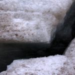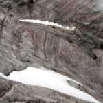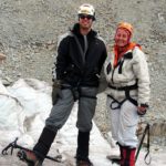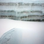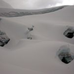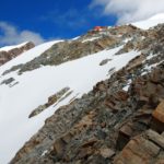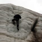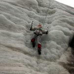 Na ňom sú už dve skupinky nacvičujúcich. Pod ľadovcom nasadíme kompletnú výstroj. Natiahneme teplé nohavice, na to postroj. Naše ľahké topánočky vymeníme za izolované bagandže a na to mačky a gamaše. V požičanej izolovanej vetrovke sme už šľapali pod ľadovec a aj sa celkom zapotili. Je ťažká a vôbec nedýcha. Zajta skúsime len bundu a tenkú vetrovku, nemá zmysel strácať minerály a vodu potením. Vaky si v drobnom snehu nechávame na skalách bez ochrany, ktorú sme zabudli na chate. Vyzbrojení cepínom vykročíme na ľadovec skúšajúc kadejaké figúry. Chodenie cikcak s čakanom vždy v ruke do svahu. Potom ideme štvornožky do strmého svahu, kde sa istíme rukavicou, čakanom a štyrmi špicíkmi na každej nohe. Nie je to také triviálne, keď človek len tak kopne do ľadu, zapichnú sa len dva špicíky, aby fungovali aj ďaľšie dva, treba dodržiavať správny uhol. Potom skúšame to isté, ale cestou dolu. Na záver ideme pod ‘kolmú‘ stenu a istení lanom sa ju pokúšame zdolať. Podľa vodcu má len 80stupňov, nie je teda úplne kolmá, ale aj tak to bola najväčšia fuška.
