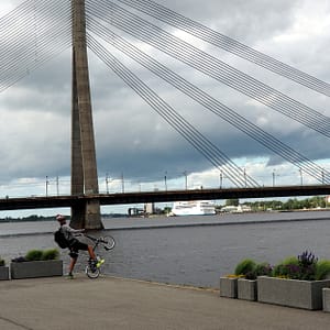 Riga je 23km bajkom po relatívne slušnom asfalte, no počasie 05.08. zase raz štrajkuje. Zastavíme si pred riekou a obdivujeme, infinity pool pred bankou. Nevesty sa fotia s panorámou Rigy. Za mostom nás čaká hrkotavá cesta dláždenými uličkami. Tu si zase raz nezajazdíme. Človek si vôbec neuvedomí, že chodí po dlažbe, pokiaľ tade nemusí ísť na bajku s malými kolieskami. Chceme obedovať v Folkklubs Ala Pagrabs, kde sme boli minule, no otvárajú až o druhej. Čas si krátime pivkom z obchodu. Na ulici stretneme auto s PD ŠPZ. Keď je konečne je otvorené – bajky si poskladáme a zložíme ich pred pódiom, na ktorom bude živá hudba až večer. Sedíme sami dvaja za veľkým stolom a veliké kreslo nevládzem takmer vôbec posunúť. Atmoška je fajná, majú megadobré remeselné pivko, kapustu s guľkami, plnené cukety a maize zupe.